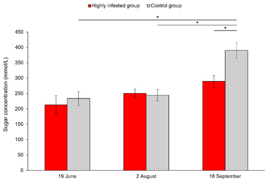 Sugar (glucose and trehalose) concentrations in hemolymph through time. On 18 September 2019, highly infested hives showed a significantly lower concentration of combined sugars in hemolymph compared to control hives (*, p < 0.001, a priori contrasts in LMM).