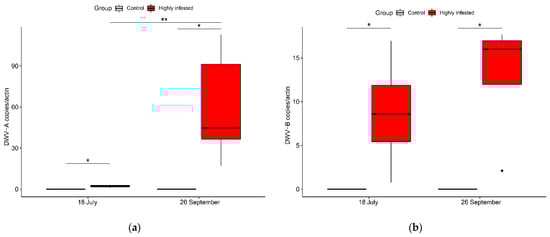 DWV loads on July and September in honeybees of highly infested and control hives: (a) DWV-A loads (copies/actin); (b) DWV-B loads (copies/actin). Overall, a predominance of DWV variant A is seen. DWV-A and DWV-B copies/actin were significantly higher in infested hives than in controls (*, p < 0.05, Mann–Whitney test), with a significant increase over time (**, p = 0.001, Wilcoxon test) for DWV-A.