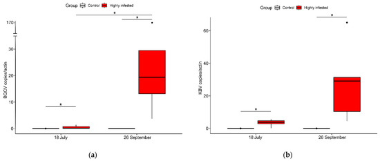 Viral loads in in honeybees of highly infested and control hives over time: (a) BQCV loads (copies/actin); (b) KBV loads (copies/actin). Viral copies/actin for BQCV and KBV were significantly different between the two studied groups (*, p < 0.001, linear model and Mann–Whitney test) at each period of the cohort study. There was a great increase of BQCV copies/actin in highly infested hives over time (*, p < 0.001, linear model).