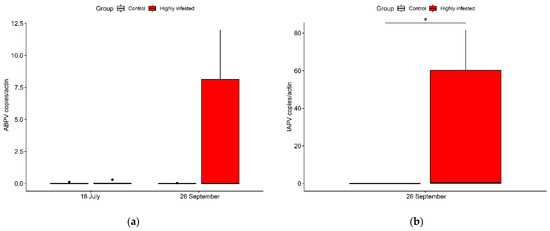Viral loads in in honeybees of highly infested and control hives over time: (a) ABPV loads (copies/actin); (b) IAPV loads (copies/actin). Infested hives Nos. 522 and 505 showed a high ratio of viral copies in September for both ABPV and IAPV. A significant difference (*, p < 0.05, t-test) between studied groups was seen for IAPV.
