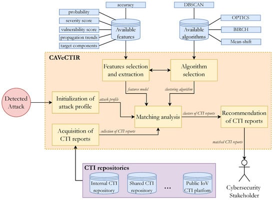 As discussed, the attack attribution process and the appropriate assignment of an attack profile are crucial steps in post-incident forensic analysis. Some characteristics and features of the detected attack can be directly extracted from the analysis of the acquired data. Others require more intense and complex procedures of processing and knowledge extraction, which are based on interrelating different CTI reports. These CTI reports are recorded in a CTI repository based on the MISP sharing platform [26]. The CTI reports might share common characteristics (e.g., attack techniques, attack models, analysis methods), and thus, they might be potentially correlated with each other. However, this information is not visible to the cybersecurity stakeholders, and thus, we propose the CAVeCTIR method, which supports the automatic interrelation and matching of a detected malicious activity with a collection of stored CTI reports. CAVeCTIR extends the CTIMatcher tool presented in our previous work [39], as it provides a more holistic solution that supports more and diverse types of malicious activities found in IoV. The CAVeCTIR aims to assist cybersecurity stakeholders (e.g., cybersecurity experts and analysts) in identifying CTI reports that describe similar malicious activities and thus boost post-incident forensic analysis. CAVeCTIR supports the following processes (Figure 1 and Figure 2), which are technically implemented through micro-services in the IoV ecosystem.