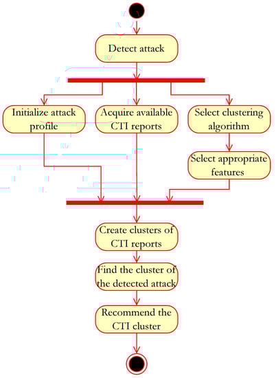 - Matching analysis: Having as input the profile of the detected attack, the acquired CTI reports, the features model, and the appropriate machine-learning algorithm, CAVeCTIR proceeds with the matching analysis, which aims to cluster the CTI reports dynamically and in real-time. Similarities and differences between the CTI reports are recorded. In the end, the detected attack is matched with one or more CTI reports, which are characterized as interrelated, meaning that they describe malicious activities, tools, techniques, and processes that share common patterns with the newly detected attack.
