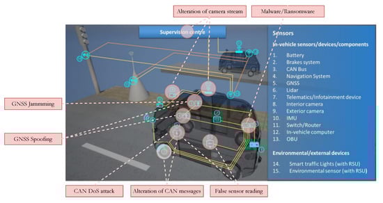 We focused on seven attack scenarios, which are critical for CAVs and IoV systems: GNSS signal spoofing, GNSS signals jamming, CAN DoS attack, alteration of CAN messages, alteration of camera stream, false sensor reading, and malware/ransomware attack. Table 2 presents a brief description of them, and Figure 3 illustrates the IoV environment and the compromised components for each scenario.