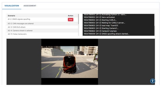 Figure 4. The user interface of the co-simulation tool used for the simulation of the attacks. - Real-world. This environment is a real smart city environment. The choice of this scenario is motivated by the fact that a real-life trial presents no danger for humans in this case (e.g., vehicle passengers, pedestrians, and other road users). It is mainly based on the communication between the road-side unit (RSU) and the CAV, with two on-board units (OBUs) installed (one responsible for the vehicle movement and the other responsibilities of the communication).