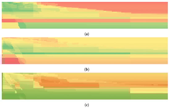 Regarding the analysis of the evaluation metrics, we produced the heatmaps depicted in Figure 5. Each heatmap reflects the assessment of each evaluation metric in a 30 × 300 matrix. Each row () represents the parameter, and each column () represents the parameter. The coloring follows a three-color scheme, with red indicating the poorest performance, yellow indicating the medium performance, and green indicating the best performance. Focusing on the evaluation parameters, this means that the greener a cell is, the higher the Silhouette coefficient is (i.e., close to 1), the higher the Calinski–Harabasz score is, and the lower the Davies–Bouldin index is (i.e., close to 0).