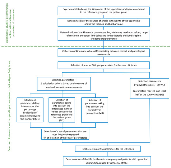 The first phase focused on the selection of 30 kinematic parameters, which provided the basis for choosing the 16 parameters of the UBI indicator. Taking into consideration the mathematical algorithm, it was assumed that the parameters had to be presented in the form of a single numerical value. Thirty parameters were selected following consultations with physiotherapists and physicians at the Miners’ Rehabilitation Centre GCR ”REPTY”, as well as on the basis of the authors’ experience. The shortlisted parameters were selected from kinematic data collected during the analysed activity of drinking from a mug.