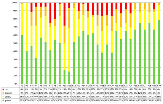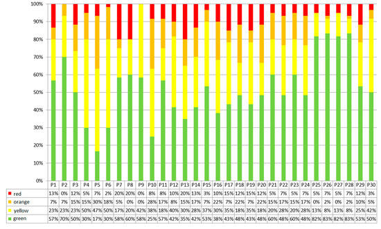Percentage distribution of results in 4 defined ranges (green, yellow, orange, red) for 30 parameters obtained from patients after stroke—non-dominant upper limb.