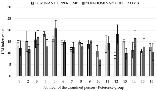 The mean value and standard deviation, as well as the minimum and maximum values of the UBI indicator obtained for the reference group have been collated separately in Table 9, for both the dominant and non-dominant upper limb. The mean values of the UBI index for the reference group were less than 14 for both the dominant and non-dominant hand. The min-max range of the UBI index for the reference group is similar for the dominant and non-dominant limb. The maximum of the UBI index did not exceed a value of 21.