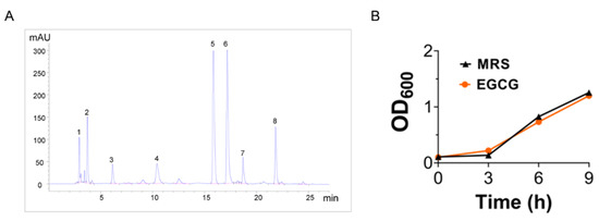 Epigallocatechin gallate (EGCG) did not affect the growth of Lactiplantibacillus plantarum 101 (LP.P101). (A) Ultra-high performance liquid chromatography of catechins. (B) Comparison of growth curves of LP.P101 in Man Rogosa Sharpe broth (MRS) and EGCG-MRS (n = 3). Data was expressed as mean ± SD.
