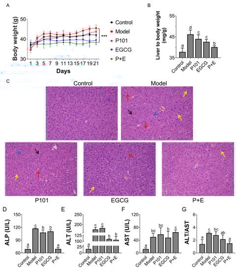 The Combination of Epigallocatechin Gallate (EGCG) and Lactiplantibacillus plantarum P101 (LP.P101) prevented liver injury caused by carbon tetrachloride (CCl4). (A) Body weight (g) of mice over 21 days. (B) Liver weight to body weight (mg/g) of mice. (C) Histology of liver tissue (200×) in each group after hematoxylin and eosin staining. Red arrow: congestion; Black arrow: inflammatory cell infiltration; Yellow arrow: ballooning degeneration; Blue arrow: loose tissue structure. (D–F) The activities of alkaline phosphatase (ALP, U/L), glutamic oxaloacetic transaminase (AST, U/L) and glutamic-pyruvic transaminase (ALT, U/L) in serum. (G) The ratio of ALT/AST. Data was expressed as mean ± SD. The significant differences (p < 0.05) among groups showed as different letters.