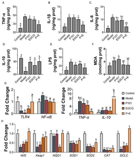 The combination of EGCG and LP.P101 reduced liver inflammation and oxidative damage caused by CCl4. (A–F) The content of tumor necrosis factor-α (TNF-α), interleukin-1β (IL-1β), interleukin-6 (IL-6), inter-leukin-10 (IL-10), lipopolysaccharide (LPS) and malonaldehyde (MDA) in liver tissue. (G) The mRNA expression level of inflammatory genes. (H) The mRNA expression level of antioxidative genes. Data was expressed as mean ± SD. The significant differences (p < 0.05) among groups shown as different letters.