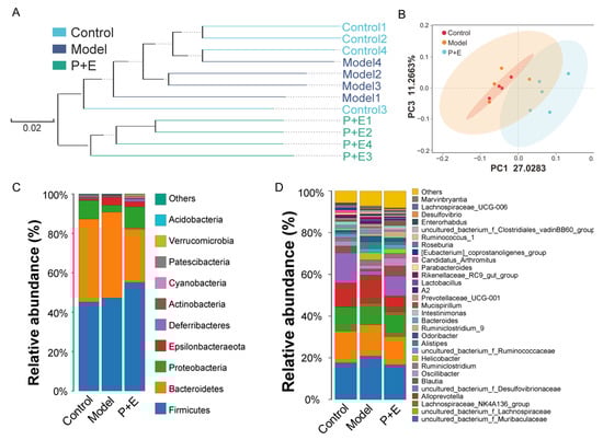 Based on the results shown above, the control group, the model group and the combination group were selected to investigate the effect of intestinal microbial diversity and composition on liver damage reduction. Although there was no significant difference in α diversity among the three groups (Table S5), β-diversity analysis showed that the composition of the control group was similar to that of the model group, while the P + E group deviated from them (Figure 4A–B). At the phylum level, the relative abundance of Bacteroidetes was decreased, while Firmicutes and Proteobacteria increased in the combination group. (Figure 4C). Specifically, the relative abundance of Desulfovibrionaceae in the model group, and Alloprevotella in the combination group, was distinctly reduced at the genus level (Figure 4D).