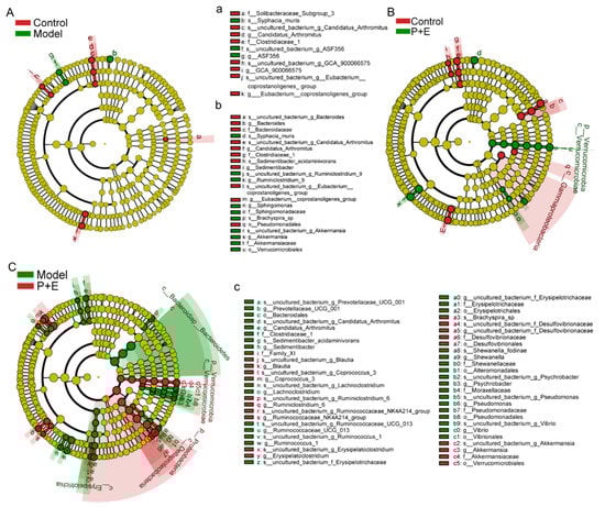 According to the results of the line discriminant analysis effect size (LEfSe) cladogram, there were only 11 significant different taxa between the control group and the model group, and less than 21 significant different taxa between the control group and the combination group (Figure 5(Aa,Bb)). In addition, the difference between the model group and the combination group was very significant, as evidenced by the 52 taxa of different bacteria in the LEfSe cladogram (Figure 5(Cc)). The different bacteria between the model group and the combination group are mainly Bacteroidates, Erysipelotrichaceae, Desulfovibrionales, Alteromonadales, Vibrionales and Verrucomicrobioles, at the order level (Figure 5(Cc)).