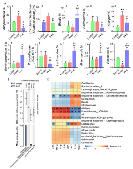 The combination of EGCG and LP.P101 modulated the relative abundance of bacteria and affected the signal expression. (A) Relative abundance of different species. a-j: relative abundance of Alloprevotella, uncultured bacterium f Muribaculaceae, Blautia, Bacteroides, Alistipes, Ruminiclostridium 9, Prevotellaceae UCG-001, Lactobacillus, Akkermansia and Roseburia. Data were expressed as mean ± SD. *p < 0.05, **p < 0.01 vs. control group; # p < 0.05, ## p < 0.01, ### p < 0.001 vs. model group. (B) Differential analysis of Kyoto encyclopedia of genes and genomes between the model and P + E group. (C) Pearson’s correlation analysis between biochemical parameters and the relative abundance of gut microbiota species. The color ranged from blue to red and indicated the change in correlation from negative to positive. Data were expressed as mean ± SD. * p < 0.05, ** p < 0.01, *** p < 0.001.