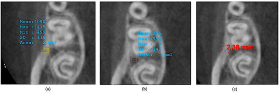 Measurement of cortical and cancellous bone density in the axial view: (a) Cortical bone density. (b) Cancellous bone density. (c) Cortical bone thickness.