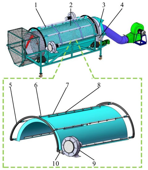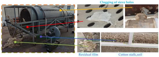 Mulching techniques have been beneficial for preserving food supplies and increasing incomes but have caused severe farmland pollution. To address this problem, domestic institutions and related enterprises have developed various types of equipment to recover residual film [1]. A recovered residual film can be used only twice after the separation of impurities [2,3,4,5,6,7]. A trommel-sieve-type residual film–impurity wind separator (referred to as a residual film–impurity wind separator from hereon) is a key piece of equipment used for debris removal. However, the sieve holes are blocked to different degrees during the operation of the equipment; this severely affects the efficiency of wind selection. This problem can be solved by installing a screen hole blockage clearing device. Therefore, to ensure the effectiveness and reliability of the screen hole blockage clearing device, the mechanism of blockage should be analyzed, and the device structure and working parameters should be optimized.