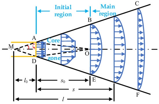As displayed in Figure 2, the airflow occurred from the circular section (with radius R) nozzle spray, with point M as the pole; ∠AMO was the diffusion angle ζ; and the exit velocity in the section with uniform distribution was v0. The jet axis MO was regarded as the x-axis. The nozzle jet and the surrounding media had a constant mass and momentum exchange. This induced a flow in the surrounding media, and the mass flow rate of the jet and the cross-sectional area of the jet along the x direction increased, thereby forming a cone-like flow field involving diffusion in the surrounding media, as depicted by the cone CAMDF in Figure 2. The jet was continuously substituted in the surrounding media, enabling boundary expansion, and the velocity of the main body of the jet decreased gradually. The part of the jet with velocity v0 was the core of the jet, represented by the cone AOD displayed in Figure 2. The section BOE was the transition section, and the section on the axis of the airflow velocity had a velocity v0. The section between the exit section and the transition section was the jet start section, and the section beyond the transition section was the jet body section [13,14,15,16].