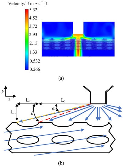 When the screen hole faced the nozzle, the trommel screen rotation process resulted in the formation of a screen hole between the two nozzles for the jet airflow. The nozzle structure determined the conditions, and adjusting the distance between the nozzle and the screen hole resulted in the coverage of the screen hole by the nozzle jet formed by the cone-like flow field boundary, as illustrated in Figure 4a. As displayed in Figure 4b, the outermost layer of the cone-shaped flow field was located within the orange and red dashed lines. Neglecting the air velocity, airflow occurred through the screen holes.
