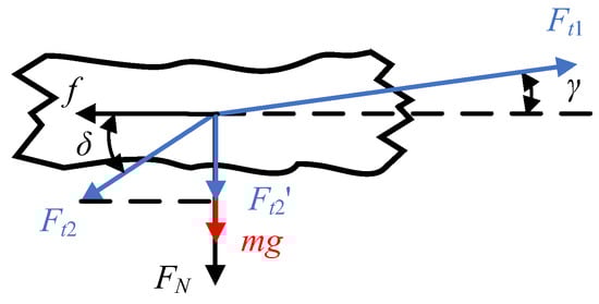 Schematic of the force of the residual film plugging process. Note: Ft1 and Ft2 denote the airflow resistance, N; Ft2’ denotes the parting force of Ft2 in the vertical direction, N; f is the friction force, N; FN is the support force on the screen surface for the film mixture, N; mg is the gravity of the film mixture, N; γ is the angle between the airflow inside the trommel screen and the horizontal direction, (°); δ is the angle between the nozzle jet clearing airflow and the horizontal direction, (°).