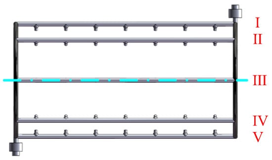 After the test, the airflow pipe was distributed symmetrically with respect to the blue dotted line, as displayed in Figure 6. The position of the trommel sieve was affected by the jet airflow of the nozzle for a longer period of time during a rotation cycle. When the airflow pipe was on the same side of the blue dotted line, one position of the trommel sieve was affected by the jet airflow of the nozzle for a shorter period of time and was more likely to cause blockage of the screen holes and increase the difficulty of blockage clearing. As illustrated in Figure 6, Fluent (Lancaster, PA, USA) software was used to simulate the airflow pipe. The divided mesh file was imported into Fluent software, the standard k-ε model was selected as the calculation model [19], and the SIMPLEC algorithm was used to calculate the equation solution [20]. The airflow pipes were arranged as follows: Ⅰ, Ⅱ, Ⅲ, Ⅳ, and V; Ⅰ, Ⅲ, and V; and Ⅱ and Ⅳ; the airflow pipe for the simulation calculations for the nozzle jet airflow velocity statistics were derived for the three arrangements.