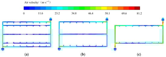 The airflow velocity vectors of the device corresponding to different airflow pipe arrangement forms were derived as illustrated in Figure 7. With the same color scale, it can be observed that when the number of airflow pipes was large, because of the conservation of inlet and outlet air volumes, the airflow in some airflow pipes was sparse and the airflow velocity was low. The airflow velocity in the manifold was higher, resulting in a pressure difference in the manifold and gas backflow in some airflow pipes. Therefore, in this duct arrangement, increasing the fan speed did not improve the airflow uniformity and airflow velocity in the pipes. After the reduction in the airflow pipe length, the airflow uniformity and speed in each pipe improved considerably. Therefore, the number of airflow pipes should be reduced as much as possible while ensuring a certain airflow to improve the airflow velocity of each nozzle.