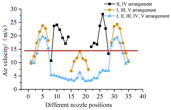 To further analyze the influence of the number of airflow pipes on the jet air velocity of each nozzle, the statistics on the nozzle jet air velocity for the three arrangements of airflow pipes are derived, as represented by the line graph displayed in Figure 8.