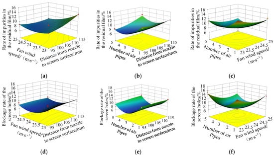 To analyze the effect of interaction factors on the response values, response surface plots of the relationship of the ratio of impurities in the residual film and the ratio of the blockage of the screen holes with each factor were constructed using the quadratic regression model [26].