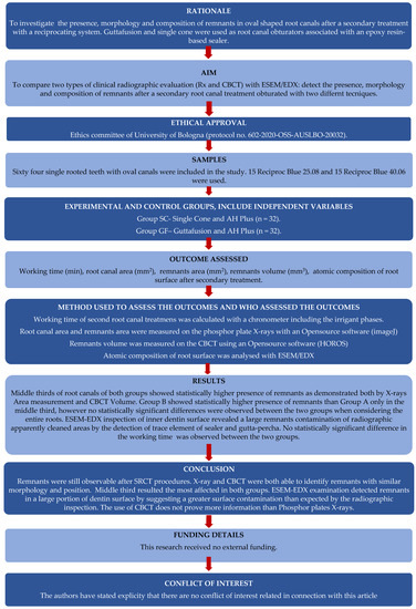 The persistence of remnants inside the root canal was detected by two radiographic methods commonly used in clinical activities and by one in vitro system to obtain more information on the ultra-morphology and composition of the remnants after the SRCTs. The presence of remnants and their positions in the root canal has been proposed [21,22,23] to be an index of the effectiveness of the SRCTs.