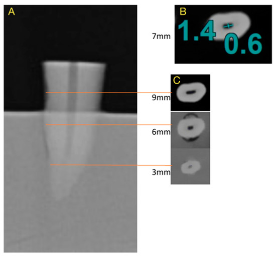 Sample selection. Preoperative X-ray (A). Preoperative CBCT: mesiodistal and buccolingual diameters of each root canal were measured at 7 mm from the apex to ensure the oval shape of the root canal (B). Axial section at 3, 6, and 9 mm from the apex (C).