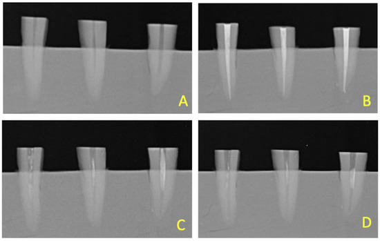 Radiographic examination of customized mold with three teeth before treatment (A), after root canal filling (B), after retreatment with RB #25, (C) and after retreatment with RB #40 (D).