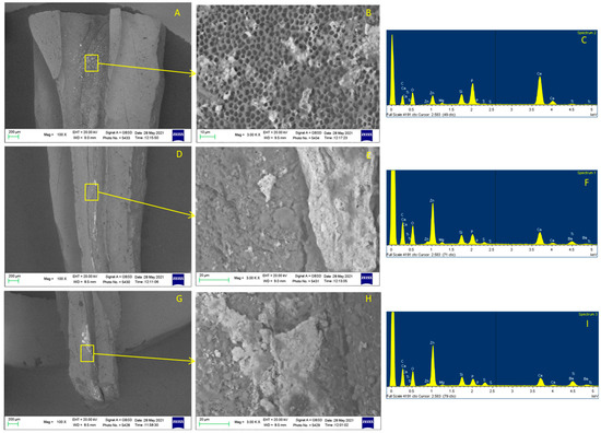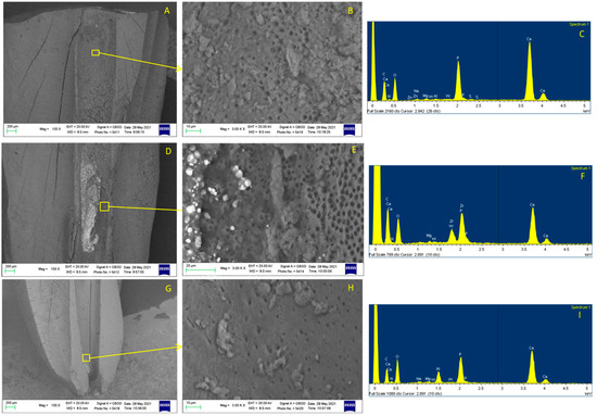 Root canal obturated with GF technique, sectioned, and examined with ESEM/EDX. Coronal third examination at 100× (A) revealed a few electron-dense granules on the dentinal surface. Dentine surface at 3000× (B) was characterized by open dentinal tubules and partially covered by the electron-dense remnants. EDX microanalysis (C) showed the presence of tracer elements attributable gutta-percha (Zn). Middle third at 100× (D) displayed a high presence of electron-dense remnants. At high magnification (3000×), (E) the remnants completely covered the dentinal structure, with no signs of tubules. Some remnants were detected in the apical portion at 100× magnification (G). At high magnification (3000×), (H) the dentinal tubules were completely covered by remnants. EDX on the remnants revealed high presence of elements from Guttafusion, namely Zn, Ba and Ti, and Si (F,I).