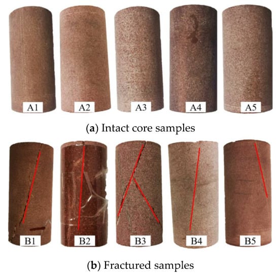 The rock samples were divided into 5 intact core samples and 5 fractured samples, which are shown in Figure 1. Rock samples were made into cylindrical standard specimens with dimensions of 25 mm × 50 mm. The absolute permeability and porosity of the ten rock samples were measured by the steady state method and alcohol saturation method, respectively, and the detailed data are shown in Table 1.