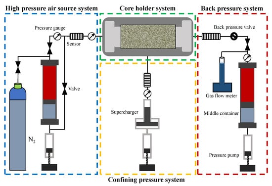 The high-temperature and high-pressure stress-sensitive test system [] was used to measure the permeability of rock sample by the steady state method, and the structure of the device is shown in Figure 2. The device consists of four parts: hole pressure system, core holder, confining pressure system and back pressure system. The maximum confining pressure that can be set for the device is 90 MPa, the maximum pore pressure is 60 MPa and the maximum temperature is 125 °C, meeting the experimental requirements. Nitrogen is stable, less prone to chemical reaction, safe and controllable, therefore it has been selected as the experimental fluid.
