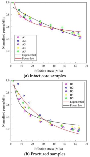 We chose exponential and power functions to fit the experimental data, and the results are shown in Figure 3. The correlation coefficients of exponential and power functions of the intact core sample were 0.9272 and 0.8899, respectively. The correlation coefficients of exponential and power functions of the fractured sample were 0.9244 and 0.9227, respectively. The correlation coefficient of exponential functions was better than that of power functions, which has the following expression: