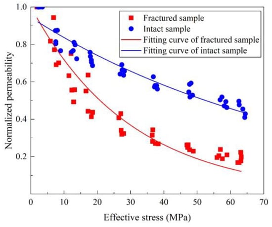 Figure 4 shows the relationships between the normalized permeability and the effective stress of both types of rock samples. The permeability decreases gradually with increasing effective stress. When the effective stress is increased from 0 to 65 MPa, the permeability of the fractured sample decreased by 81.28%, and the permeability of the intact core sample decreased by 54.67%, indicating the permeability stress-sensitivity of the target formation couldn’t be ignored. Additionally, the permeability stress-sensitivity of the fractured samples was found to be higher than that of the intact core samples.