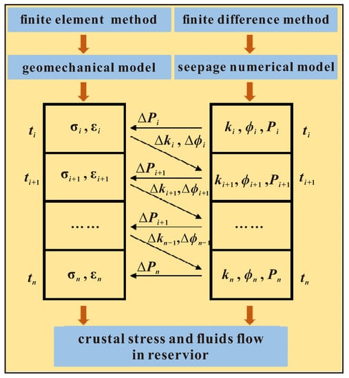 The simulation is based on the Petrel RE simulation software, which calculates the seepage numerical model according to the finite difference method, and the geomechanical model using the finite element method, as shown in Figure 5. The two types of models are coupled by iterative coupling and the pore-permeability parameters of the seepage numerical model are updated according to the geomechanical model data. The established simulation scheme improves the computational efficiency and the accuracy by real-time data transfer between the fluid flow and geo-stress [,].