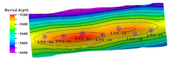 The structural feature of the study block is the anticline trap, with seven wells distributed in rows on the anticline, and the structural map of the top of layer K1BS1 is shown in Figure 6. The burial depth is about −5500 m~−6900 m, reservoir thickness is about 290 m~380 m, the study block is about 8600 m long from east to west, and about 2500 m~2800 m wide from north to south. The geological grid model is established, the plane grid size is 100 m × 100 m, and the number of plane grids is 86 × 26, and according to the horizon thickness it is divided into 50 vertical grids, with size of 6.5 m.