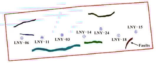 Redefining model coordinates to facilitative analysis, the coordinate system is established with the southwest corner point of the model as the coordinate origin, the east-west direction as the X-axis and the north-south direction as the Y-axis. Numerical simulations were performed for 2090 days on seven wells (LNY-06, LNY-11, LNY-03, LNY-14, LNY-24, LNY-18 and LNY-15) based on the coupled seepage-geomechanical model. From the results of the numerical simulations, the seepage characteristics, stress variation, permeability stress-sensitivity evolution law and productivity of the target formation were analyzed.