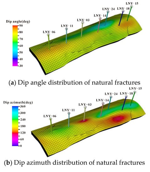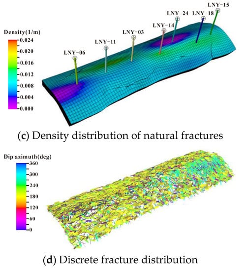The target formation contains faults and natural fractures, and the distribution of the faults is shown in Figure 7. The faults are mainly E-W strikes with a dip angle of 80°~85°. The natural fractures are mainly near E-W strikes with dip angles of 70°~90°. Combined with the fracture interpretation results of image logging in the target formation, we upscaled and interpolated the dip angle, azimuth and density of natural fractures, and established a discrete fracture model of the reservoirs, as shown in Figure 8. The natural fracture properties were transformed into the geological grid model using the Oda method []. The porosity of the natural fractures was calculated to be about 0.00005%~0.0002% andthe three-dimensional permeability was about 0.1~50 mD. The dual pore-permeability model was adopted in the numerical simulation. Figure 9 shows the form of conduction between the fracture grid and matrix grid. Each matrix grid corresponds to a fracture grid. The fluid flow and the energy transfer can be achieved between the matrix grid and its corresponding fracture grid, and also its adjacent fractures.