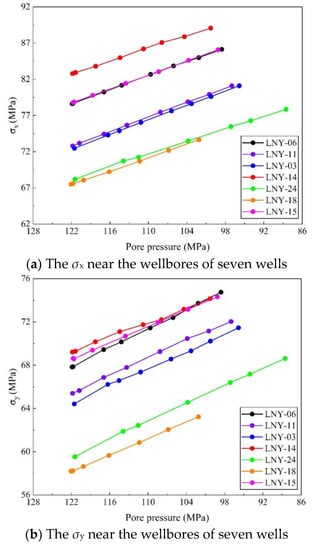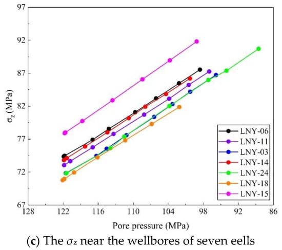 The change in reservoir pore pressure will cause a change in effective stress and the deformation of reservoir rock []. The stress condition around the well plays a key role in wellbore stability during development []. Figure 11 illustrates the relationship between the pore pressure near the wellbore and the three-dimensional effective stress. The initial pore pressure of the formation is about 120–125 MPa, which gradually decreases as the development time increases. The pore pressure near the wellbore decreases to 85–100 MPa by the end of the simulation, which is essentially the same as the bottom hole pressure. The change rule of effective stress is opposite to that of pore pressure. The three-dimensional effective stress increases, among which the effective stress in the X-direction (σx) increases by 5~10 MPa, the effective stress in the Y-direction (σy) increases by 4~9 MPa and the effective stress in the vertical direction (σz) increases by 11~19 MPa. The difference in three-dimensional effective stress evolution is mainly caused by the difference in reservoir depth, rock mechanical parameters and pore-permeability parameters.