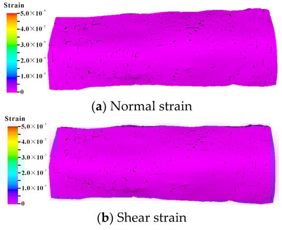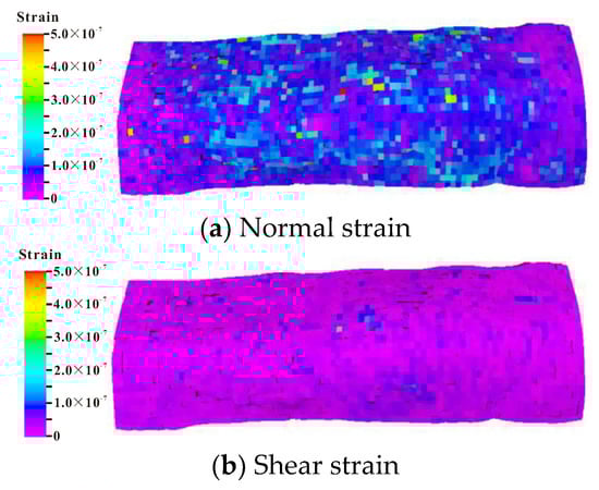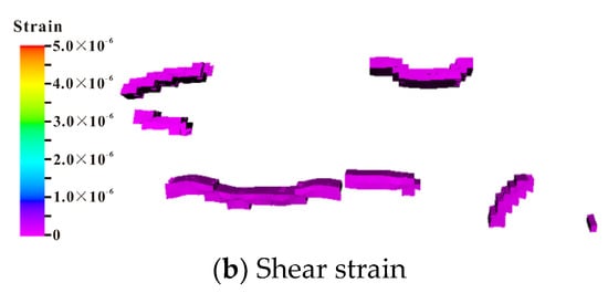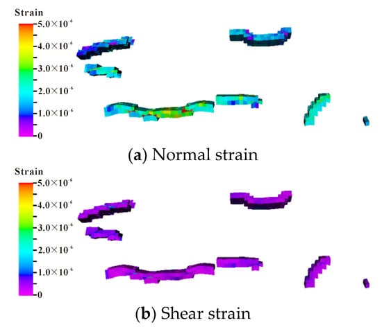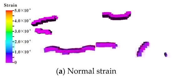 The deformation of natural fractures and faults during the development was simulated. The initial conditions of natural fracture and fault deformation variables were both set to zero. After 2090 days of development, the elastic normal strain and elastic shear strain of the faults were about 3.0 × 10−7~1.0 × 10−6 and 2.0 × 10−7~8.0 × 10−7, respectively, and the shear strain was smaller than the normal strain. The variation in plastic normal and plastic shear strain of the faults was zero, indicating that the fault had not reached the damage slip stage, as shown in Figure 12 and Figure 13. The elastic normal strain and elastic shear strain of the natural fractures were about 1.0 × 10−7~4.0 × 10−7 and 2.0 × 10−8~1.0 × 10−7, respectively, and the variation of plastic normal and shear strain of the natural fractures was zero, indicating that the natural fractures also did not reach the damage slip stage during the development process, as shown in Figure 14 and Figure 15.