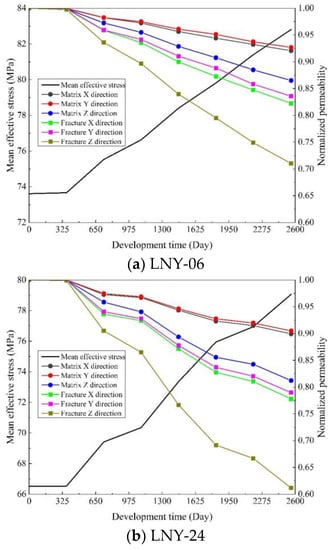 The relationship between permeability and effective stress can reveal the mechanism of permeability stress-sensitivity in gas reservoir depletion development. Figure 16 shows the variation of normalized permeability and average effective stress (σo = (σx + σy + σz)/3) near the wells of LNY-06 and LNY-24 during gas reservoir development. The effective stress near the well increases and the permeability gradually decreases during depletion exploitation, exhibiting a high stress-sensitivity. Meanwhile, the figure shows the three-dimensional permeability of the fracture and matrix, with the greatest decay of permeability in the Z-direction of the fracture and the least decay of permeability in the Y-direction of the matrix.