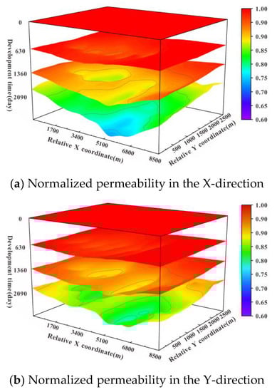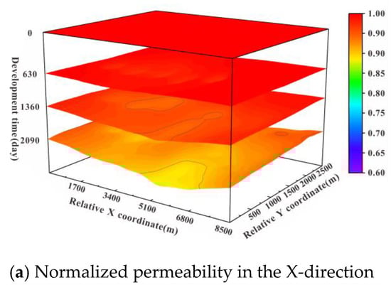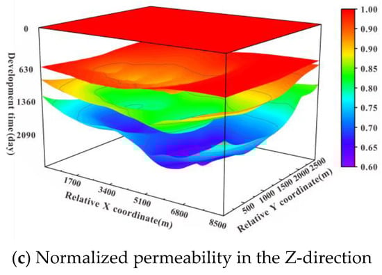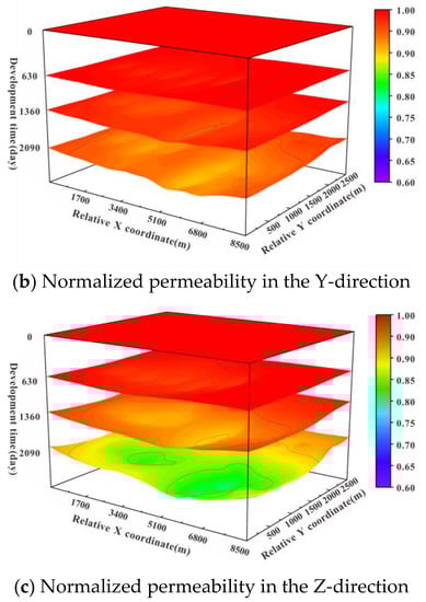 - The reservoir heterogeneity can have an impact on the permeability variation, which is manifested by different changes in three-dimensional permeability. The vertical permeability decreases are the most pronounced. The permeability of the fractured zone and the matrix decreased by about 40% and 16%, respectively;