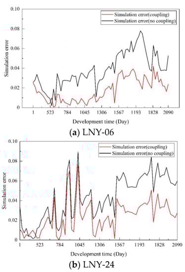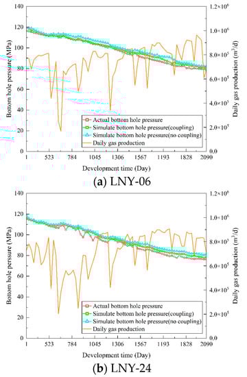 Two types of models were used to simulate fixed production rate of the seven wells in the target formation. The first considered permeability stress-sensitivity while the second did not consider permeability stress-sensitivity. Figure 19 and Figure 20 show the historical fitting results and bottom hole pressure error analysis for wells LNY-06 and LNY-24. Combining the data of the seven wells, the actual bottom hole pressure, the bottom hole pressure of the first type model and the bottom hole pressure of the second type model decreased to 79.64 MPa, 81.48 MPa and 83.42 MPa, respectively, after 2090 days of development. In the early stage of production, the formation pressure shows little change and the deformation is relatively small. The bottom hole pressure change curves for the two types models are basically equal. In the later stage of production, the pore pressure decreased significantly and the reservoir permeability decreased, while the rate of decline in bottom hole pressure increased. The mean square errors between the historical gas production results and the simulation results with and without permeability stress-sensitivity considered were 2.22 and 4.01, respectively. This indicates that the permeability stress-sensitivity is one of the factors affecting gas production.