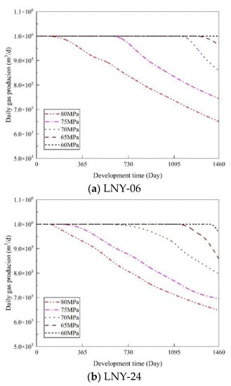 Reducing the bottom hole pressure can effectively increase the production of the well, but too much pressure reduction will reduce the formation permeability and may also lead to sand production in the wellbore and cause damage. Reasonable determination of the bottom hole pressure is of great significance for efficient production. In order to analyze the impact of bottom hole pressure changes on production, the production prediction for 4 years was determinedon the basis of the historical fit. The maximum daily production rate of 1.0 × 106 m3 and five types of bottom hole pressure were set. The two sets of conditions were constrained to each other. Figure 21 shows the production curves for wells LNY-06 and LNY-24 under different bottom hole pressures. With a bottom hole pressure of 60 MPa, the well production can be maintained at 1.0 × 106 m3 for 4 years. With a bottom hole pressure of 80 MPa, the well production is lower than 1.0 × 106 m3 in the early stage of production. When the bottom hole pressure is between 60 and 80 MPa, the production of the well can be stabilized at 1.0 × 106 m3 in the initial stage, and the production gradually declined with development.
