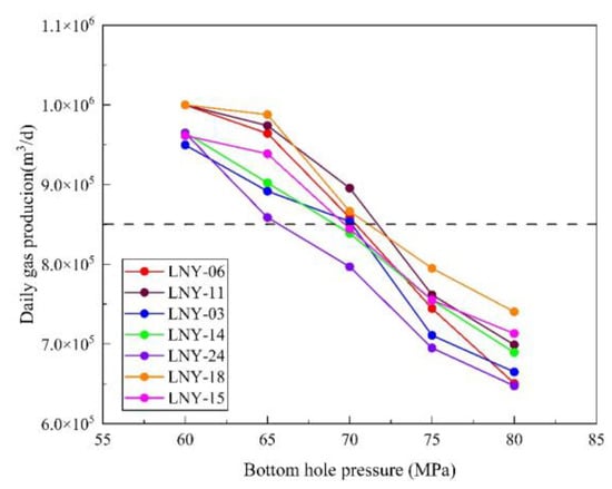 Figure 22 shows the production in seven wells at different bottom hole pressures at the end of the simulation. The gas well production gradually decreases with the increase in bottom hole pressure. With a daily gas production of 8.5 × 105 m3 as the target, a gray reference line was made in Figure 21, and the production of each well is better when the bottom hole pressure is 70 MPa. Based on the results of the production prediction and structural characteristics of the target formation, the production optimization program of gas wells was determined []. The four wells LNY-06, LNY-11, LNY-03 and LNY-18 have sufficient gas sources and all produce more than 8.5 × 105 m3 when the bottom hole pressure is 70 MPa, so the existing scheme should be maintained to continue production. The gas production of LNY-14 and the LNY-15 is 83.87 × 105 m3 and 84.46 × 105 m3, respectively, when the bottom hole pressure is 70 MPa. In order to get close to the production target, slight depressurization should be carried out. The gas production of LNY-24 is 79.68 × 105 m3 when the bottomhole pressure is 70 MPa. The bottom hole pressure should be reduced and the production of the well should be monitored during the development. Therefore, LNY-24 should be optimized by combining depressurization and observation.