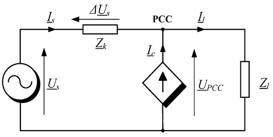 To control voltage in a LV distribution line, a shunt-connected compensator is connected as shown in Figure 1. The distribution network is modeled as a lumped parameter model, characterized by source voltage Us and short circuit impedance Zk. The compensator is a 3-phase Voltage Source Inverter (VSI) equipped with any type of energy storage on the DC side. It can provide flexible active and reactive current injection to the grid and is represented by a controlled current source Ic. Together with the load Zl, it is connected at the Point of Common Coupling (PCC).