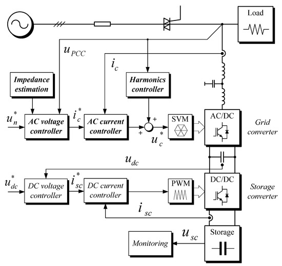 To implement the described voltage-regulation strategy, a low-level control system for the grid-interfacing power electronic converter is developed. The whole system and its control block scheme are depicted in Figure 3. It is assumed that the energy storage in the form of a battery or super-capacitor bank is connected through the DC–DC converter to the DC-link capacitor of the grid converter. It operates in closed-loop DC voltage control mode; therefore, the grid converter is free to exchange active and reactive power with the network, within its capacity.