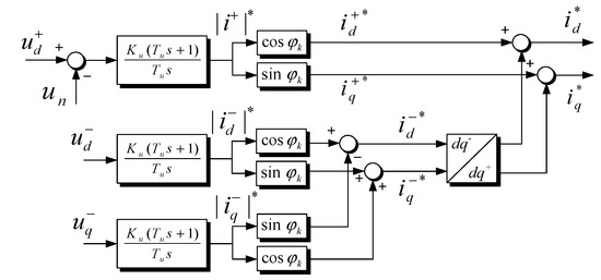 Details of the voltage controller are shown in Figure 5. Negative voltage sequence components uq+ and uq− are given as errors to the proportional–integral (PI) controllers. For the positive sequence, the difference between voltage set point uN and voltage module ud+ is used as a controller error (quadrature component uq− is neglected, as it is regulated to zero by PLL). The estimated grid impedance Zk parameters are used in the voltage control loop. Its modulus is used for controller tuning, while its phase angle φk allows to determine active and reactive current components, which satisfy the minimum compensator current criterion explained in Section 2.2.