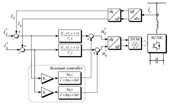 The current controller operates in the positive rotating SRF. Here, a negative sequence appears as oscillating components with double grid frequency. Typically, applied PI controllers do not provide a dynamic response high enough to control this oscillating component. To overcome this problem, a resonant path is added in parallel to the controller, as shown in Figure 6. Tuning this path to the double grid frequency results in cancellation of the steady-state error for oscillations representing negative current sequence. Gains of current PI controllers used in the algorithm are tuned using symmetrical optimum method, while gains of voltage PI controllers used in the algorithm are tuned using magnitude optimum method.
